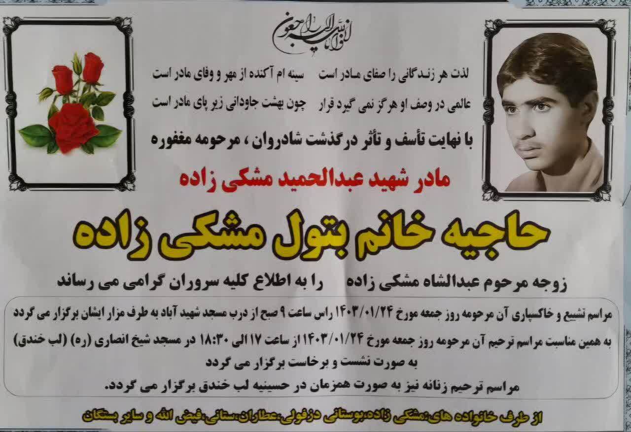مادر شهید والامقام عبدالحمید مشکی زاده آسمانی شد.