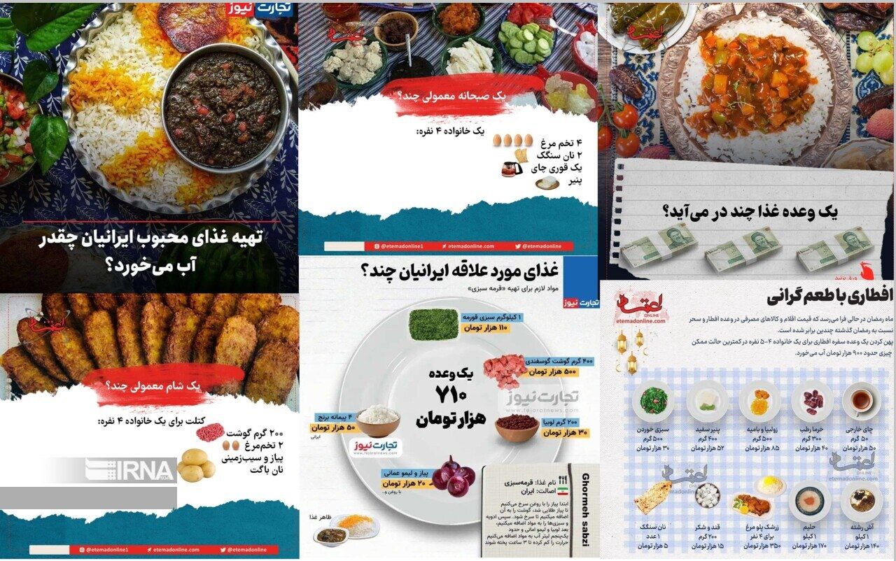 از این دست مقایسه‌ها را در روزنامه‌ای مانند «اعتماد» نیز می‌توان به شکل متعدد به چشم دید. با فرارسیدن ماه مبارک رمضان (اسفند پارسال) این روزنامه در داده‌نمای خود سفره‌ای حجیم چید که بر اساس آن برای یک خانواده ۴-۵ نفره در کمترین حالت ممکن چیزی حدود ۹۰۰ هزار تومان آب می‌خورد؛ این رقم یعنی ۲۷ میلیون تومان فقط برای وعده افطار.