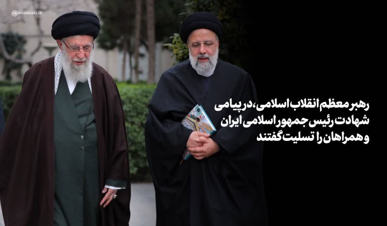 حضرت آیتالله خامنهای در پیامی شهادت حجتالاسلام والمسلمین سیّدابراهیم رئیسی رئیسجمهور اسلامی ایران، دکتر امیرعبداللهیان وزیر امور خارجه، حجتالاسلاموالمسلمین آلهاشم نماینده ولیفقیه در آذربایجان شرقی، دکتر رحمتی استاندار آذربایجان شرقی و همراهان گرامی ایشان در سانحه هوایی را تسلیت گفتند.
